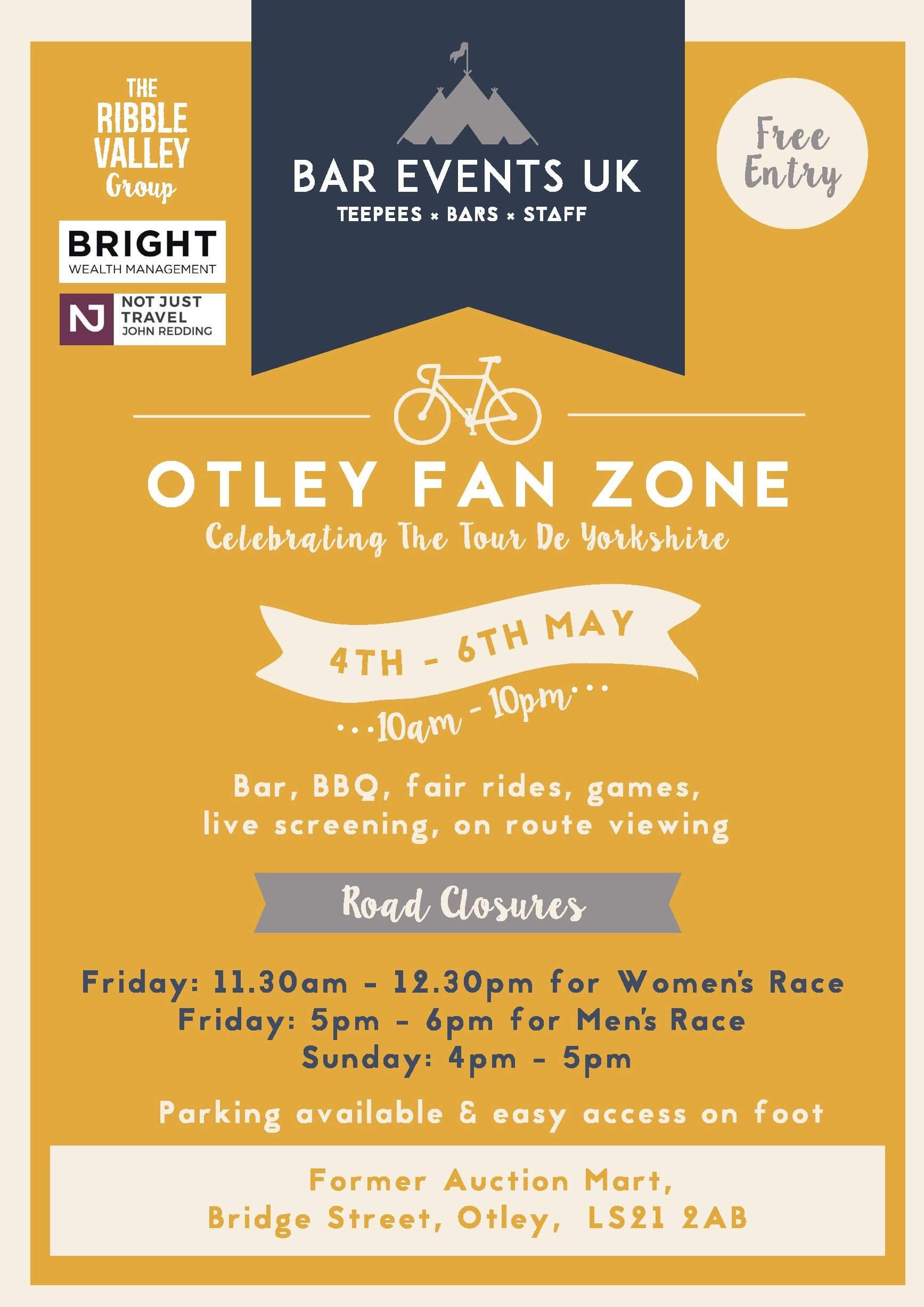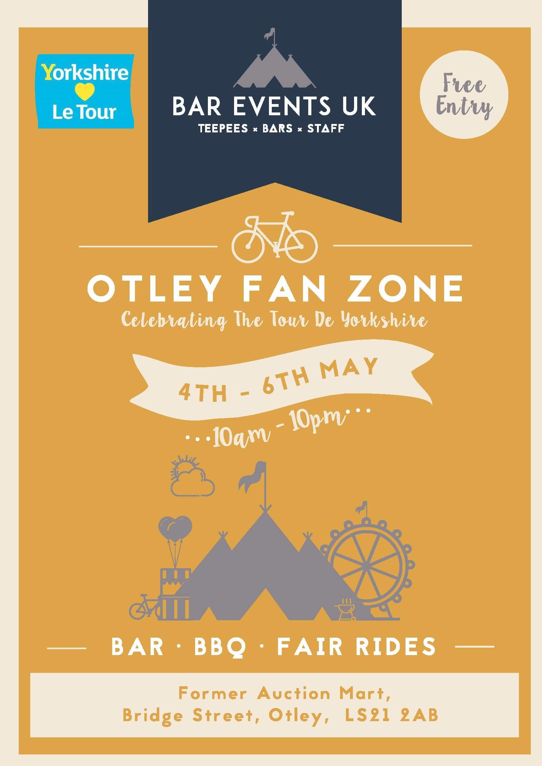 This year we created ‘Otley Fan Zone’. Open 10am – 10pm from Friday 4th – Sunday 6th May it featured a giant teepee bar, food stalls, rides, family fun and much more!