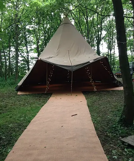 The most recent teepee hire was to a lady in Wetherby, she wanted a festival style teepee party in her back garden. We installed 2 giant teepees, a fire pit, tables & benches, a stage, dance floor, fairy & festoon Lights, and ran a full free bar for her.