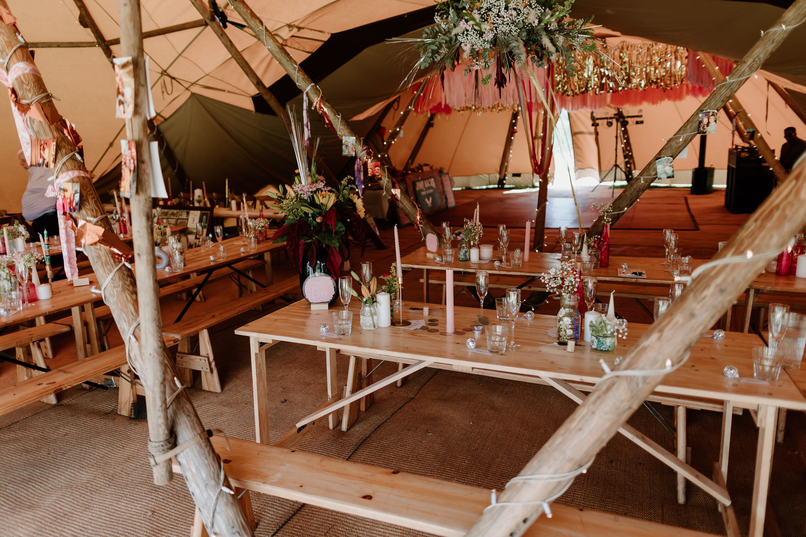 That said, tipis already come with plenty of character. The natural materials, curved lines and exposed wooden poles bring warmth and texture before you’ve added a single flower. Add in festoon lighting, rugs, foliage, or hanging installations, and you’ve got a space that’s entirely bespoke.